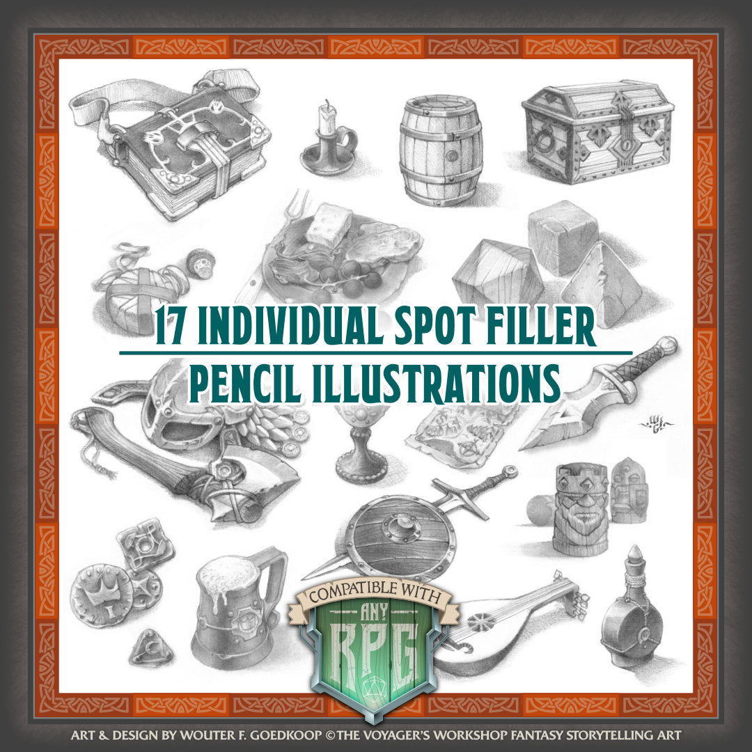 This unique Stock Art Pack consists of 17 individual spot filler illustrations, hand drawn in pencil by yours truly. It's an ideal collection for adding some medieval fantasy flavour to your RPG publication. It comes with a non-exclusive licence that you must agree to in order to use the images included in this pack. You can view the licence here.