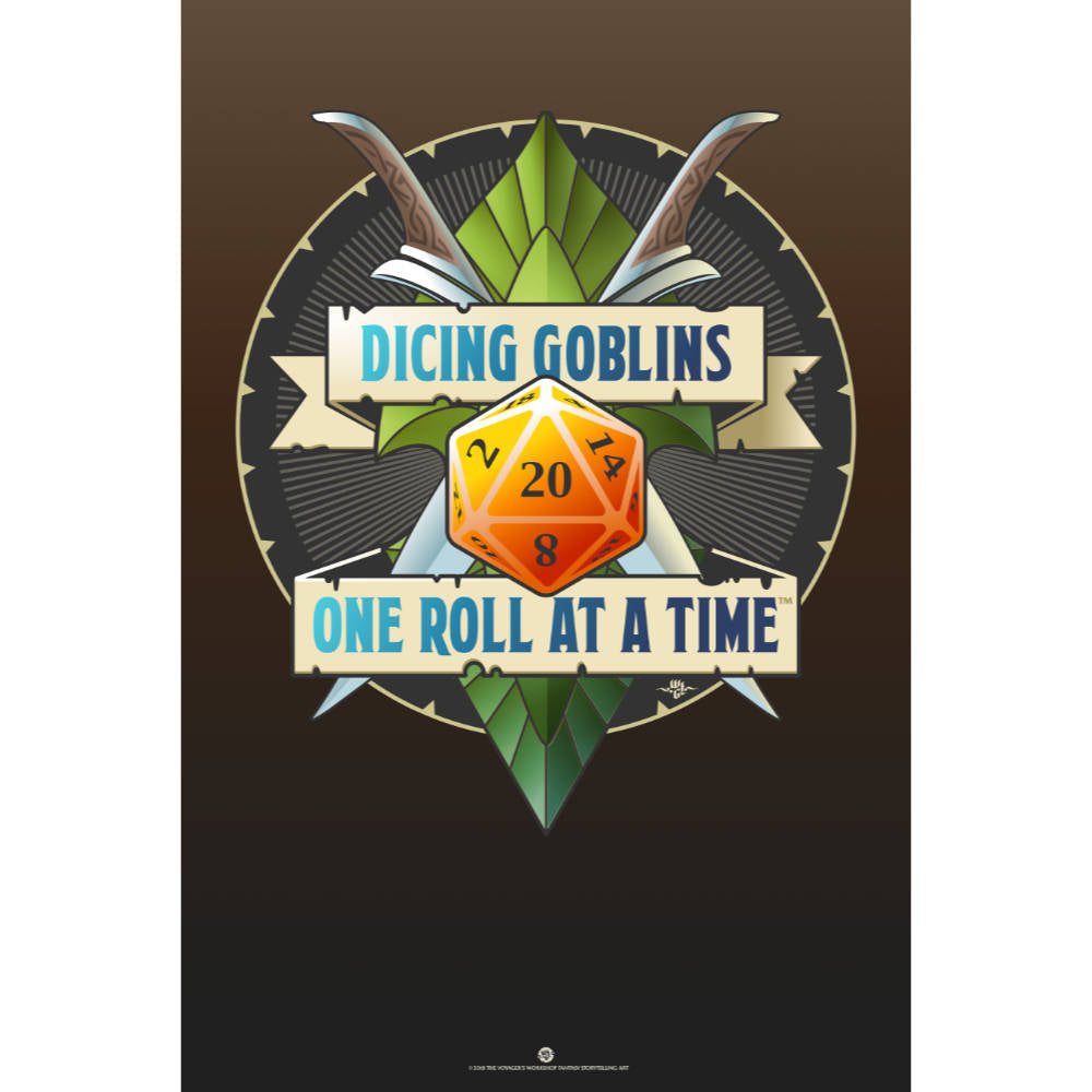 No matter your level, surviving in the wild often comes down to "Dicing Goblins, one Roll at a Time!" Whatever your game is, show off your passion with pride with this great design featuring a d20, two short swords and an elven shield. The perfect poster for any fantasy tabletop RPG player!
