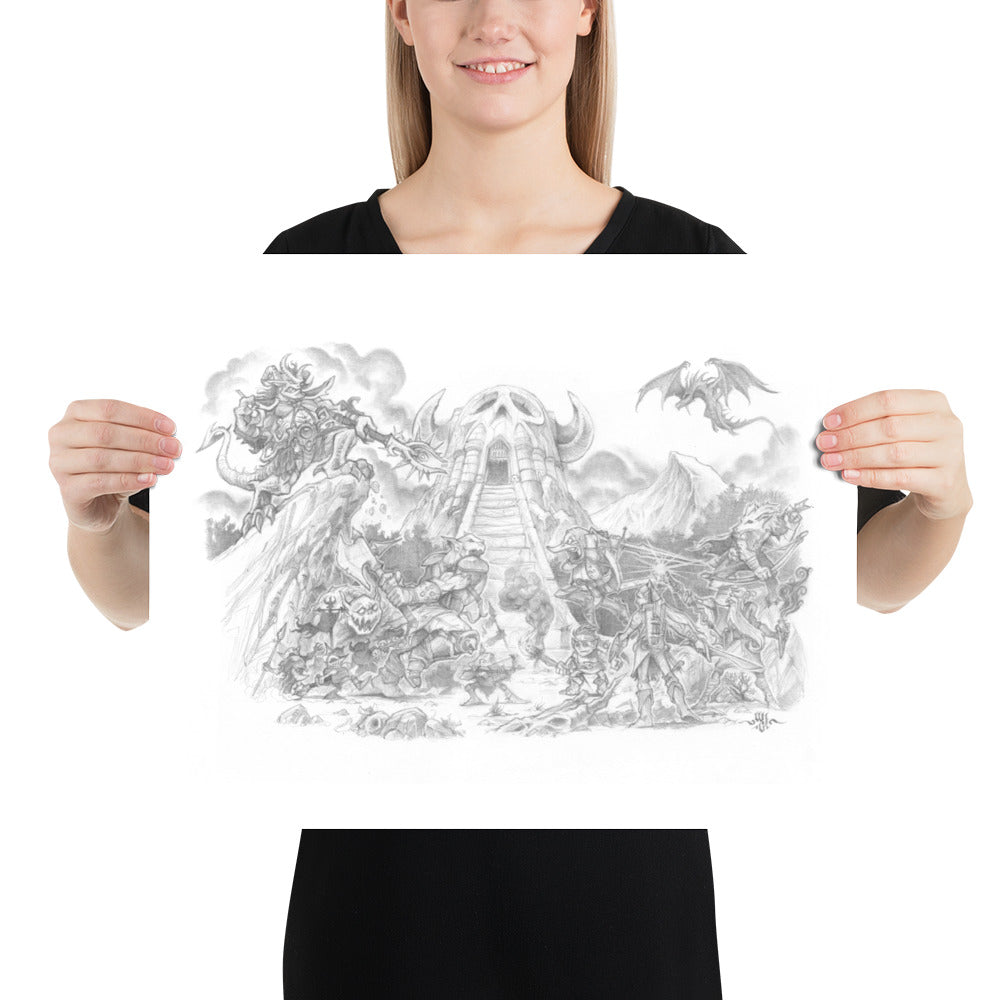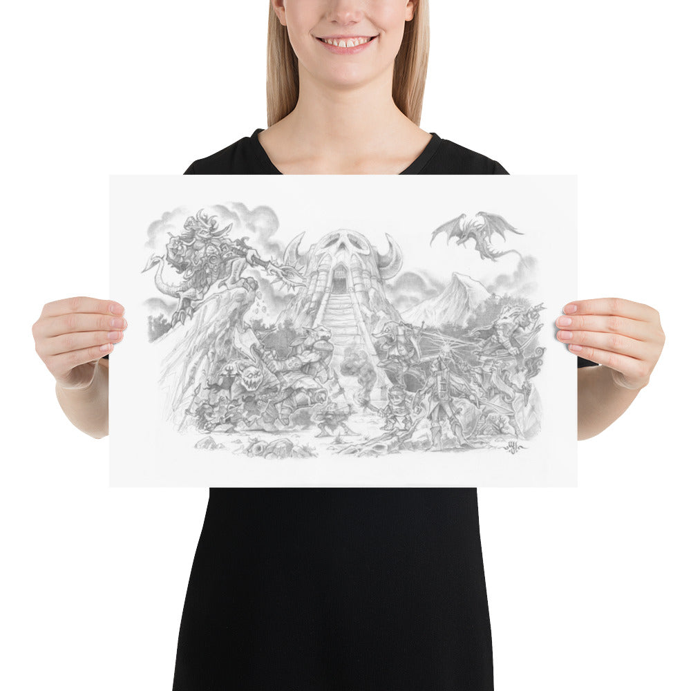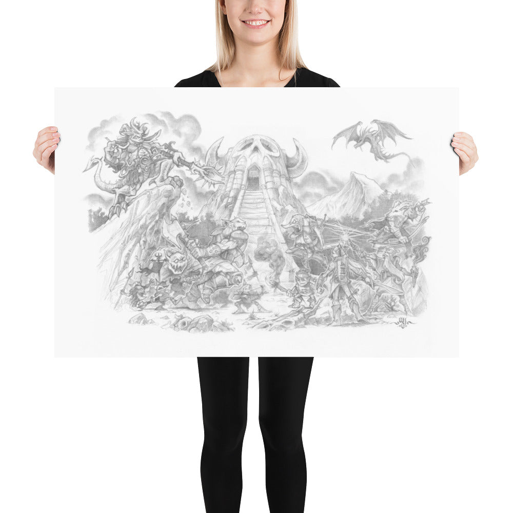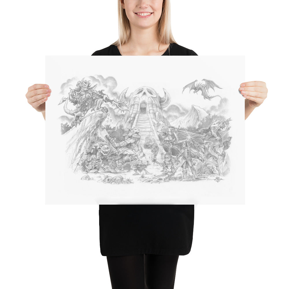 An evocative pencil sketch of a dark fantasy world encounter between a party of bold adventurers and a Demon Lord. Set with an obscure and menacing temple in the background, this showdown features a Halfling mariner, an Elf blacksmith, a Human mage, a Mallard knight and a Wolfkin hunter facing off with a Demon and his horde of Orcs, Goblins and other minions!