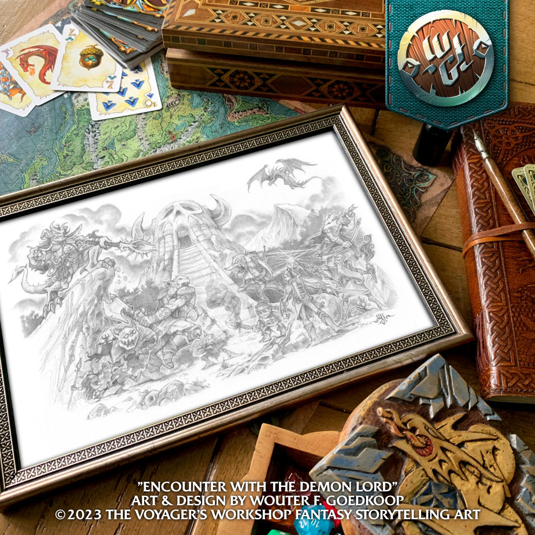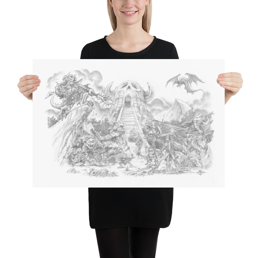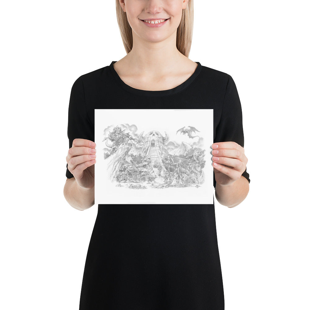 An evocative pencil sketch of a dark fantasy world encounter between a party of bold adventurers and a Demon Lord. Set with an obscure and menacing temple in the background, this showdown features a Halfling mariner, an Elf blacksmith, a Human mage, a Mallard knight and a Wolfkin hunter facing off with a Demon and his horde of Orcs, Goblins and other minions!