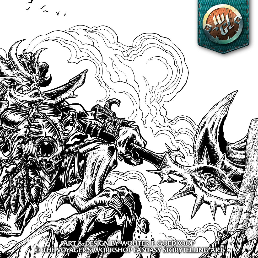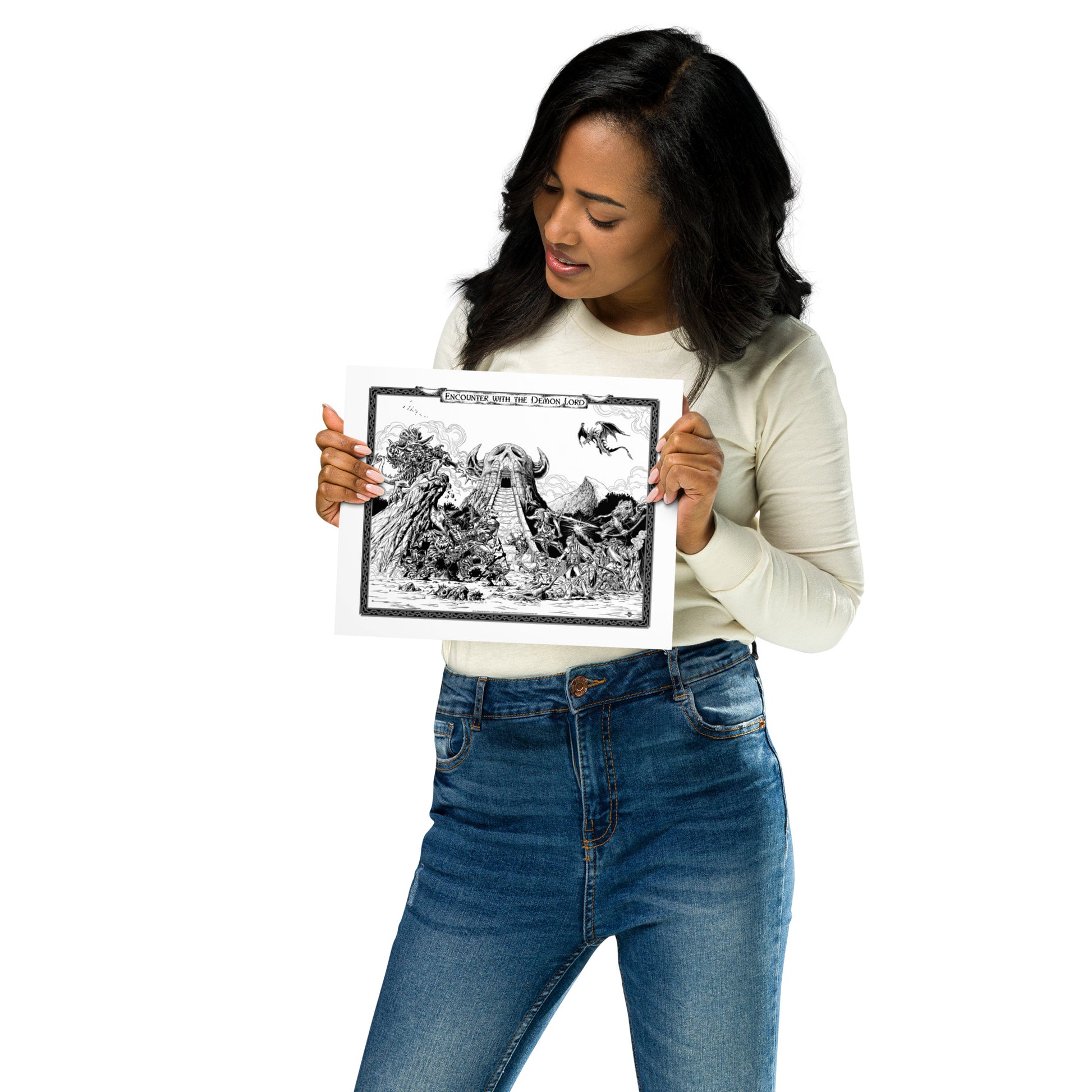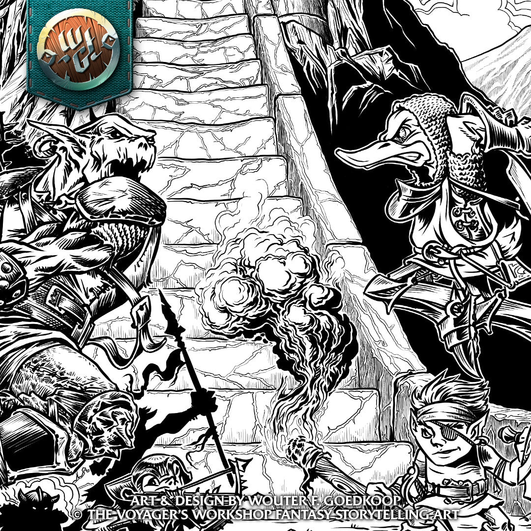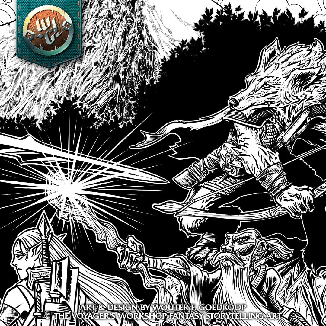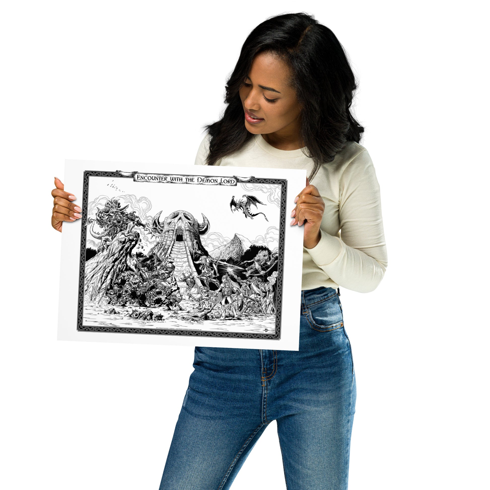 An evocative black & white inked illustration of a dark fantasy world encounter between a party of bold adventurers and a Demon Lord. Set with an obscure and menacing temple in the background, this showdown features a Halfling mariner, an Elf blacksmith, a Human mage, a Mallard knight and a Wolfkin hunter facing off with a Demon and his horde of Orcs, Goblins and other minions!