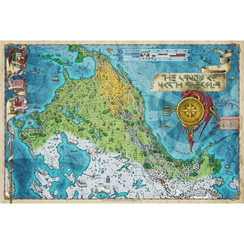 This grandiose illustration (36x24 inches - 91x61 cm) is a fully digitally hand drawn representation of the Lands of North America as a whimsically fantasy map. This world has literally been thrown on its head as you will find that North points down and mythical creatures of all sorts can be found roaming strange yet familiar realms. All texts are written in english but they are displayed in an imaginary alphabet with custom designed typefaces to make this medieval fantasy world even more immersive.