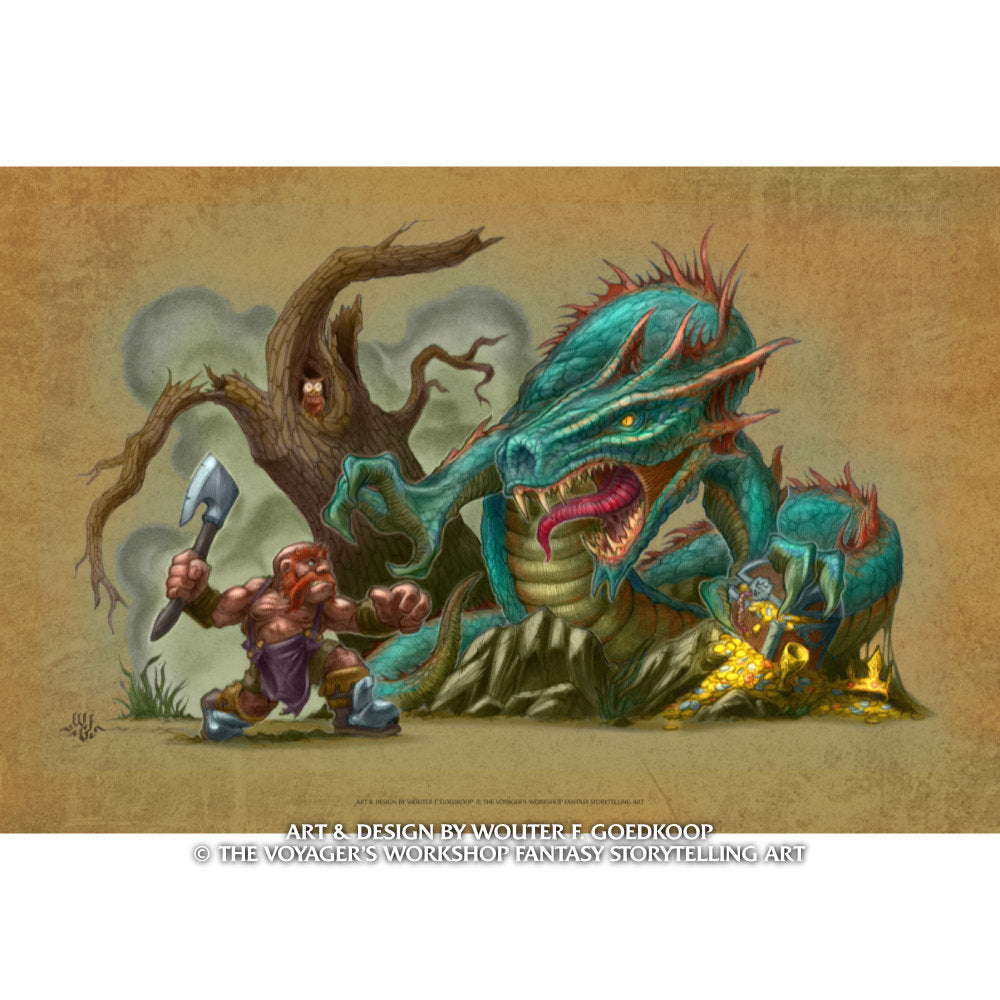 "Having left his home town for high adventure, Thurdin stumbles upon a chest filled with more gold than he would ever make in a lifetime of forging horseshoes and nails. Guarding the coveted treasure sits a Lindworm, fiercer than any recounted in stories of old."