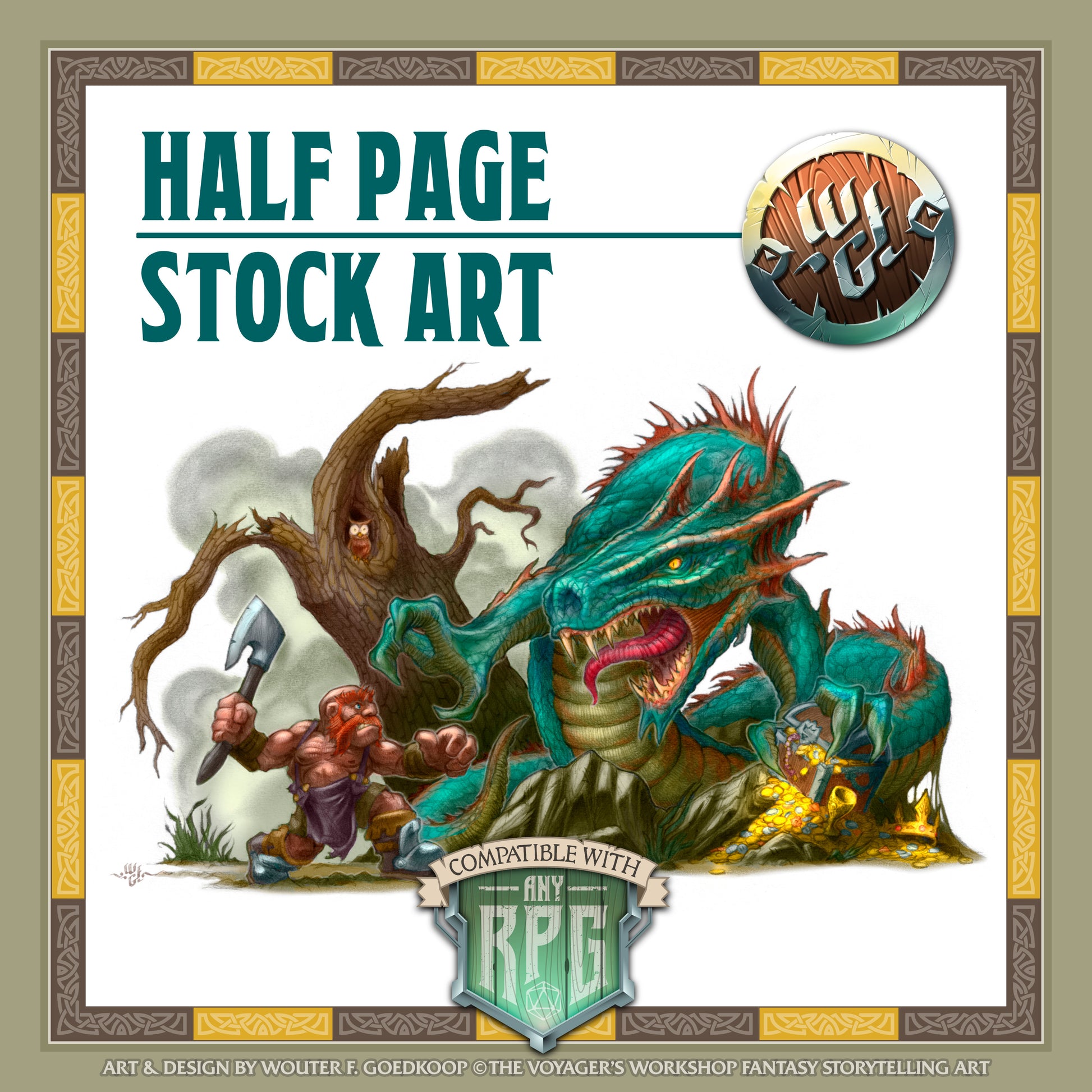 It's an ideal illustration for adding some medieval fantasy flavour to your RPG publication. It comes with a non-exclusive licence that you must agree to in order to use the images included in this pack. You can view the licence here. The image is a half-page transparent PNG, full size in RGB at 300 DPI.