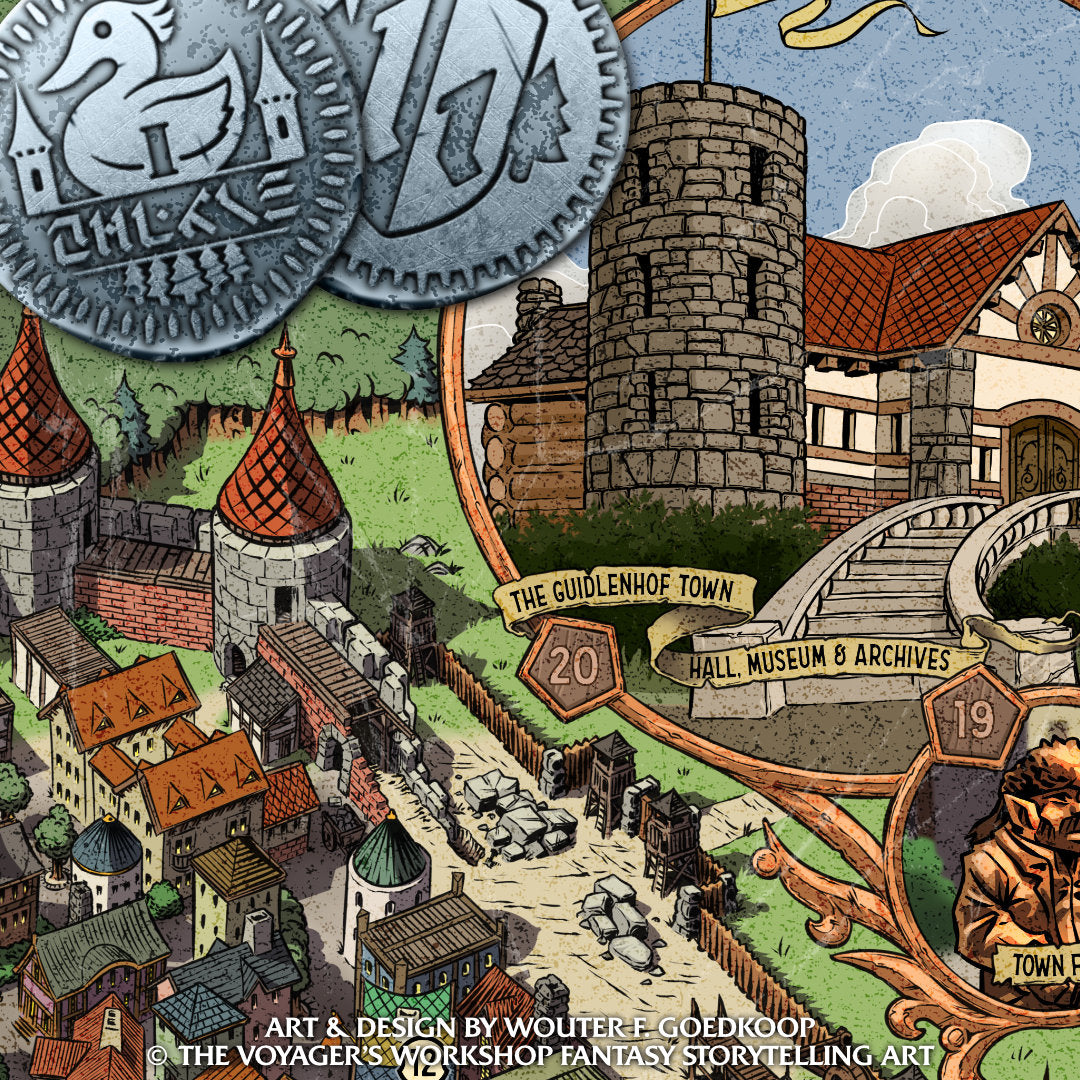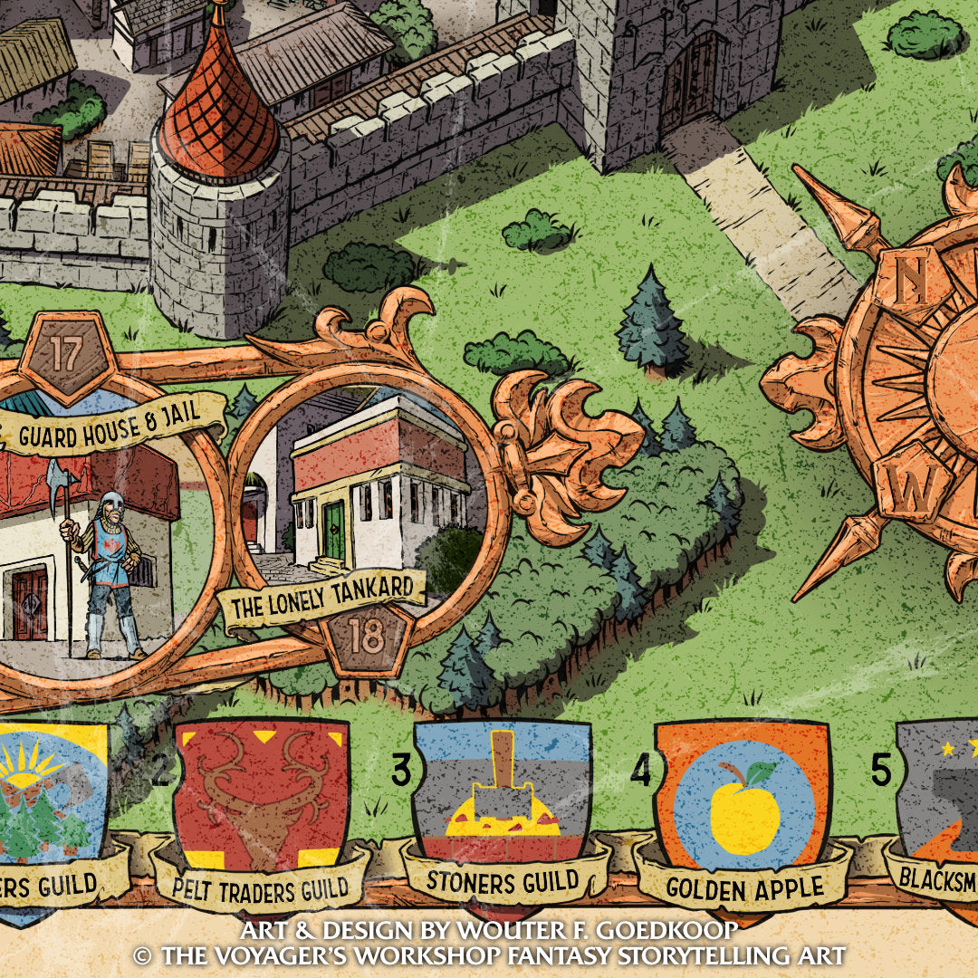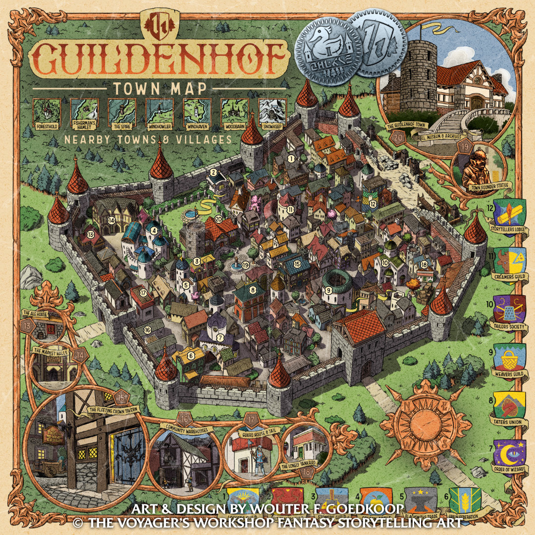 Welcome to Guildenhof, a fortified town built by traders, artisans and farmers. This massive full colour isometric map brings this unique setting to life, making it readily available for you to use in your home brew fantasy role-playing game of choice. This print comes in a variety of sizes and is accompanied by a PDF flyer version providing your players with some additional information to use at the table.