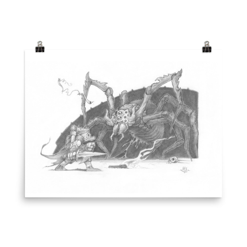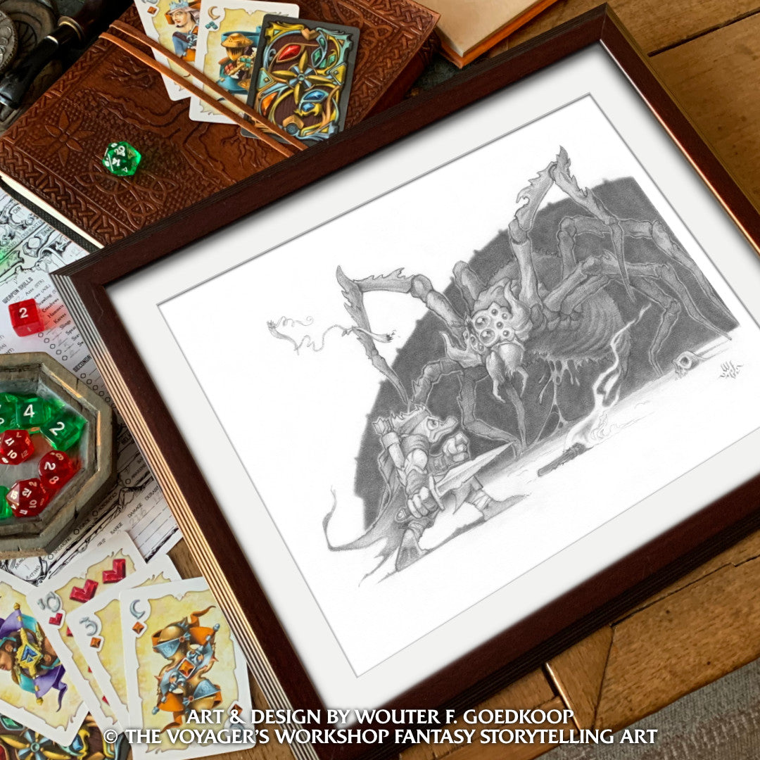 "Deep in the entrails of ancient ruins, a resourceful Mallard hunter weighs in his options as the odds seem to have shifted in the giant horned spider's favour."