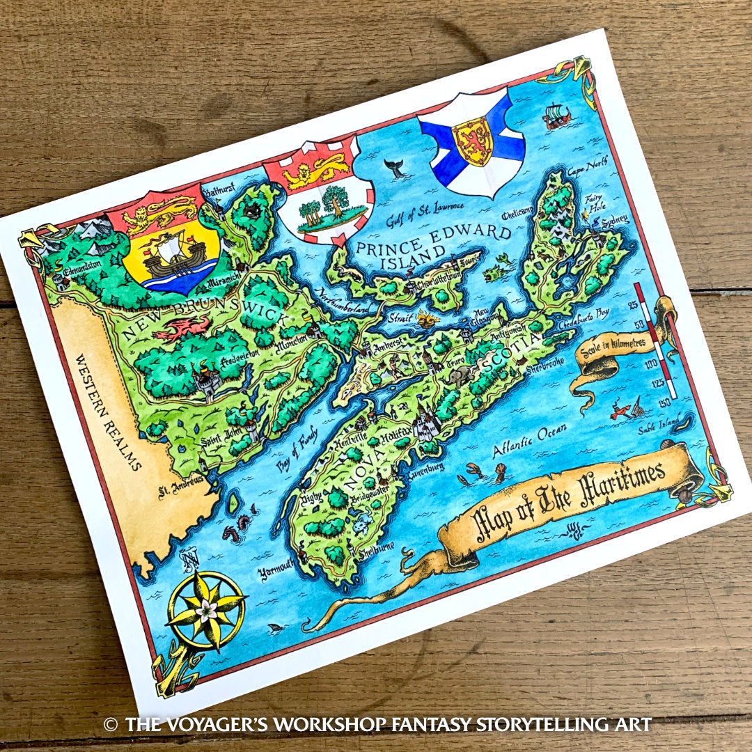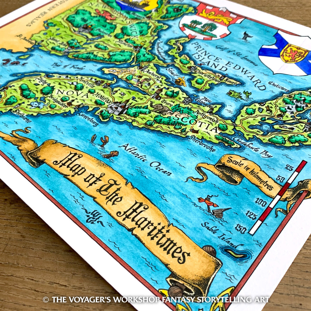This map is a fantastical representation of the Canadian Maritimes, hand inked and painted on watercolour paper. It makes for a truly unique gift for fans of high fantasy, especially those with a connection to New Brunswick, Prince Edward Island and Nova Scotia.