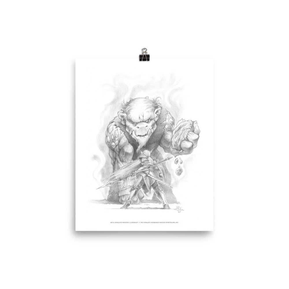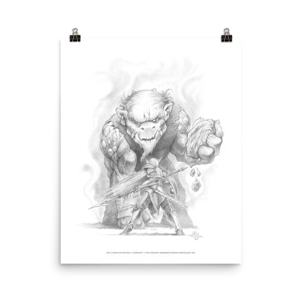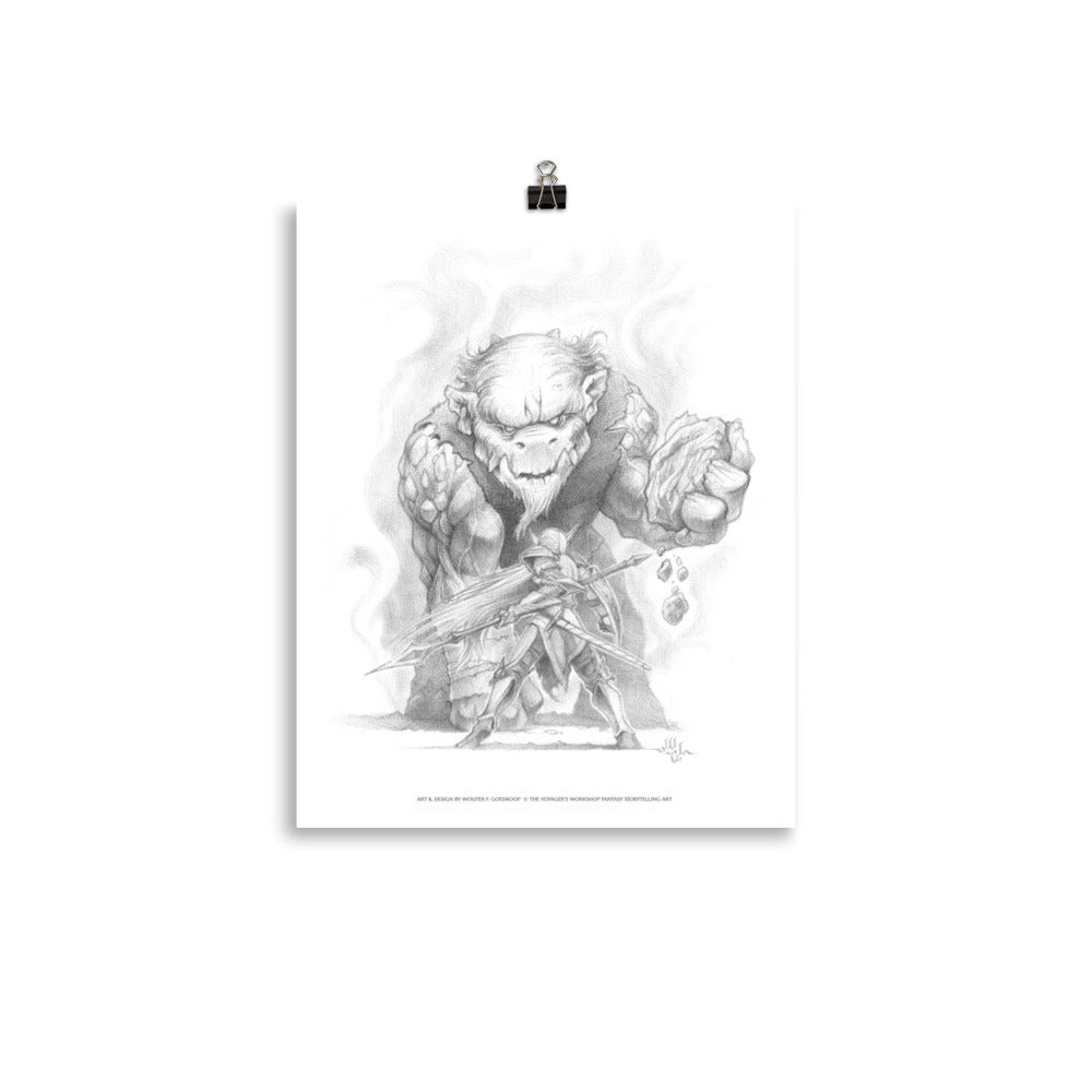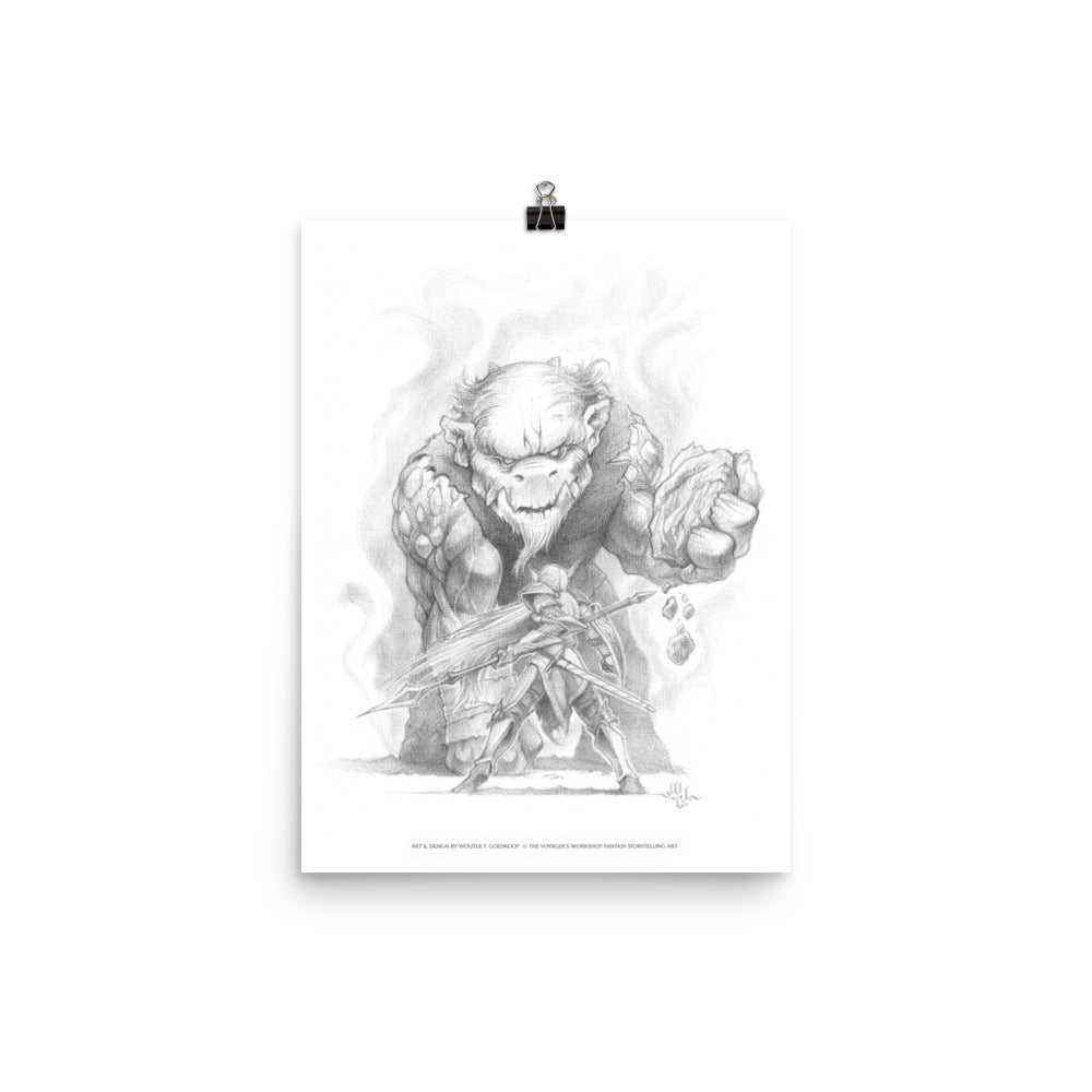 This, hand drawn in pencil by yours truly, dark fantasy illustration captures a decisive moment in an unbalanced encounter, when a troll looks to try out his family's ancestral recipe of rock salt elven purée.